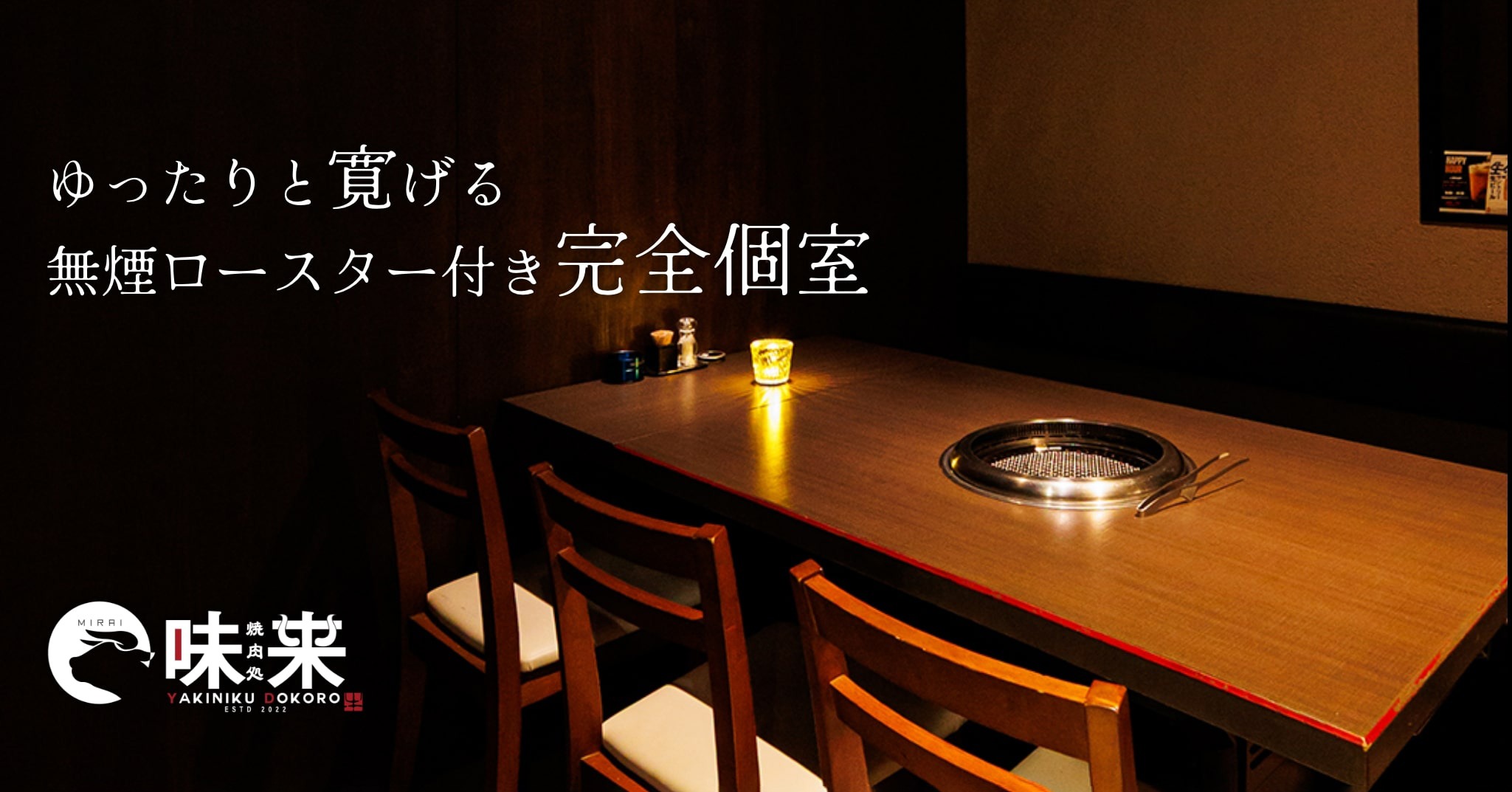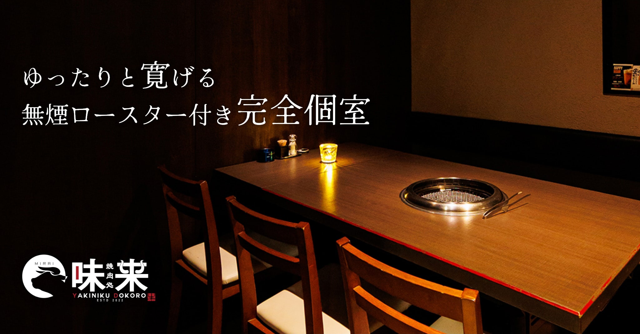 『焼肉処 味来(みらい)』では、周りを気にせずゆったりとお食事を楽しめる完全個室4卓・半個室6卓をご用意しております。落ち着いた照明と木の温もりを感じる上質な空間は、デートや女子会、接待、宴会など幅広いシーンに最適。全席に無煙ロースターを完備しており、香りは楽しみながらも煙やにおいを気にせず快適にお過ごしいただけます。
