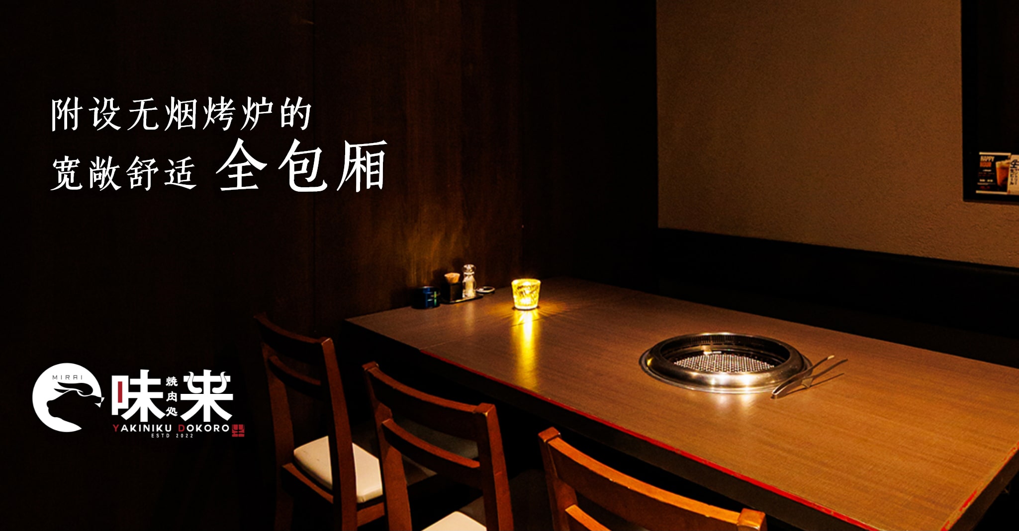 「烧肉处 味来」,我们提供 4 间完全包厢与 6 间半包厢,让您能在不受周围干扰的环境中悠闲用餐。温暖的木质感与柔和灯光营造出高质感的空间,非常适合约会、女孩聚会、商务招待或宴会等多种场合。全席皆配置无烟烤炉,让您既能享受美味香气,又不必担心烟味,舒适自在地度过用餐时光。