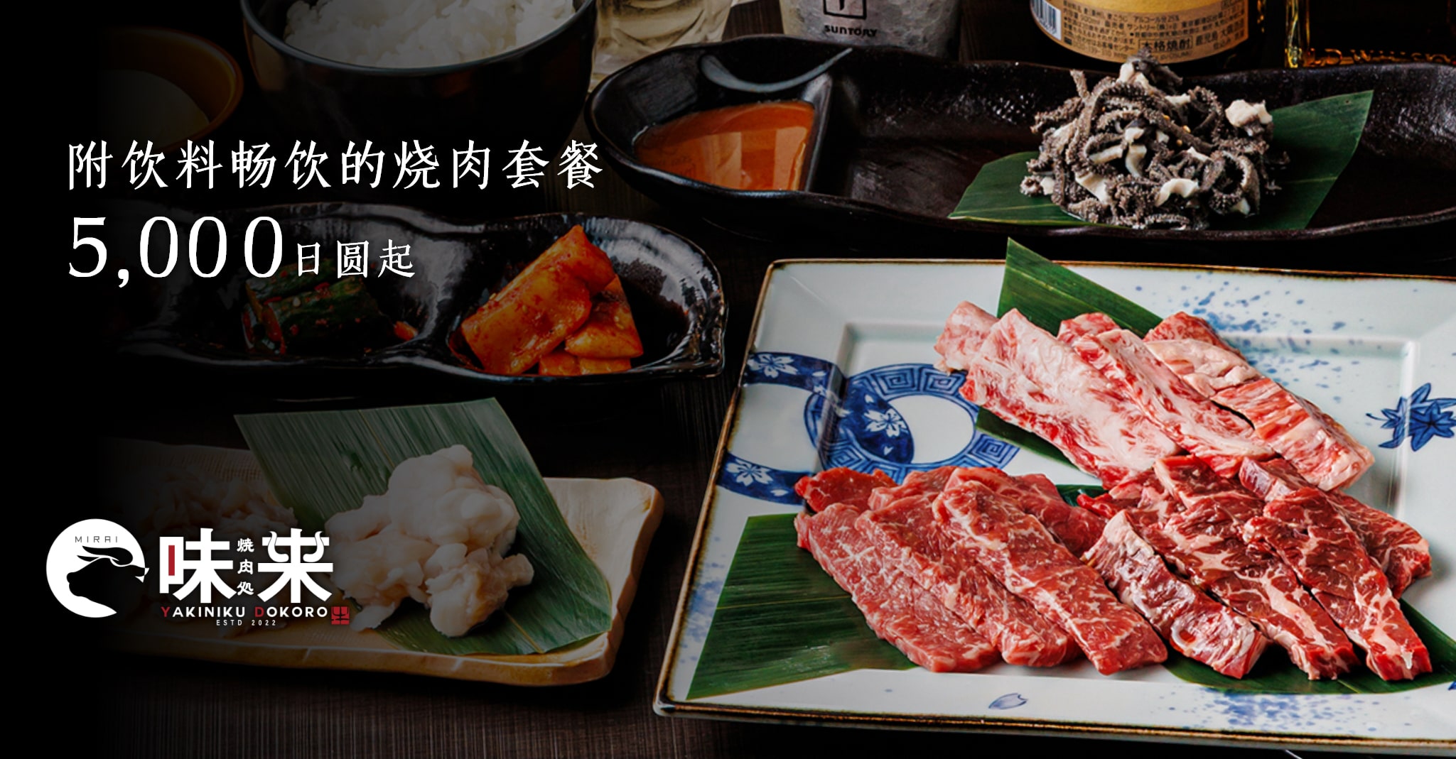 附 120 分钟畅饮的味来招牌套餐,非常适合宴会或欢送迎会。套餐以人气部位为主,共 10 道料理,内容丰富、满足感十足,价格从 5,000 日圆(含税)起。此外,只需额外加 1,650 日圆即可将香草冰淇淋更换为庆生盘,非常适合生日或纪念日使用。
